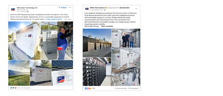 Hashtags may be used in moderation (max. three per post) and serve to form a long-term link between them and the brand. Examples: #solarpower #solarenergy #energystorage.